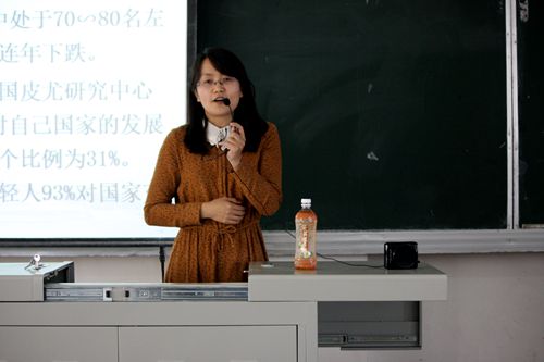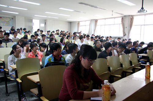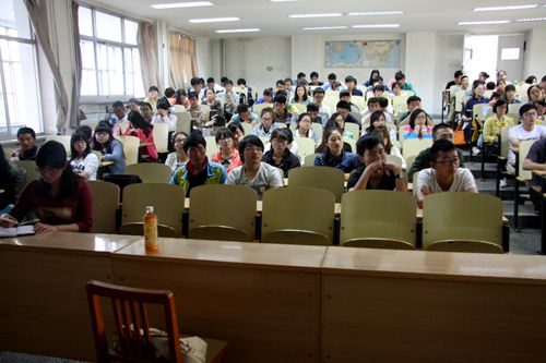 党建工作基本情况”以及“当代大学生肩负的历史使命”。报告中,奥海玮深入浅出地讲解了中国梦与党的建设的关系,所举实例与学生日常生活息息相关,使得在场同学对于习近平总书记所说的中国梦有了更深层次的理解。随后,奥副部长提出了“中国梦与美国梦的区别”这个问题,引发了在场同学们积极地思考,同学们各抒己见,畅所欲言;最后,奥部长还与同学们合唱了革命歌曲《映山红》,使得现场气氛活跃到了极点,并在热烈的掌声中结束了此次报告。