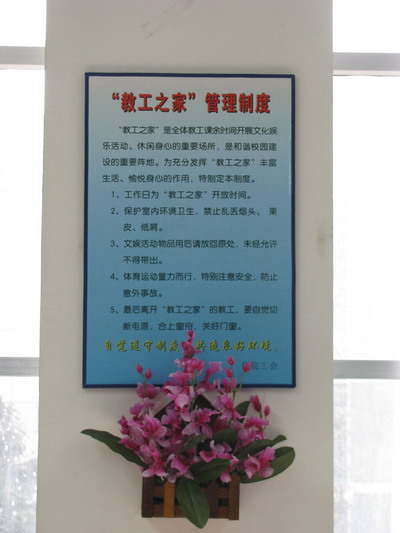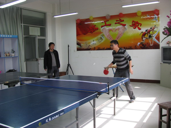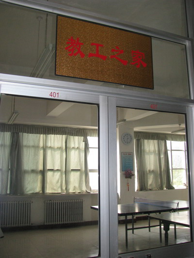 401室。为满足广大教工不同的文体爱好,“教工之家”配备了乒乓球桌、象棋、围棋、扑克、毽子、跳绳、气排球及DVD机等。书架上摆放的教师生活剪影,记载着点点滴滴的快乐;绿绿的盆栽使这个“家”有了生命的气息。