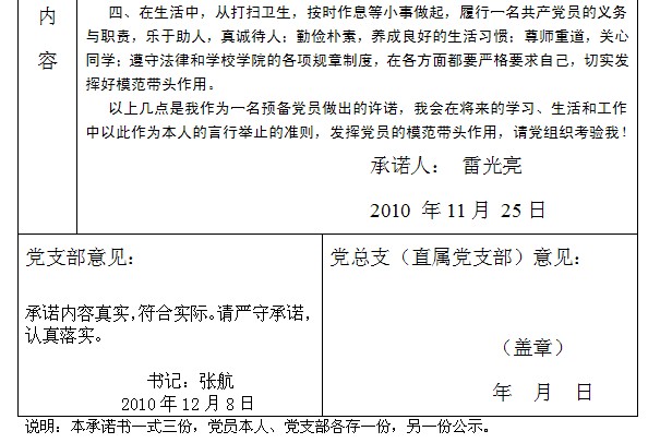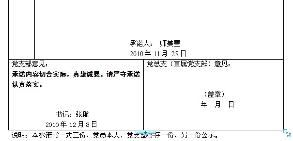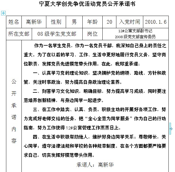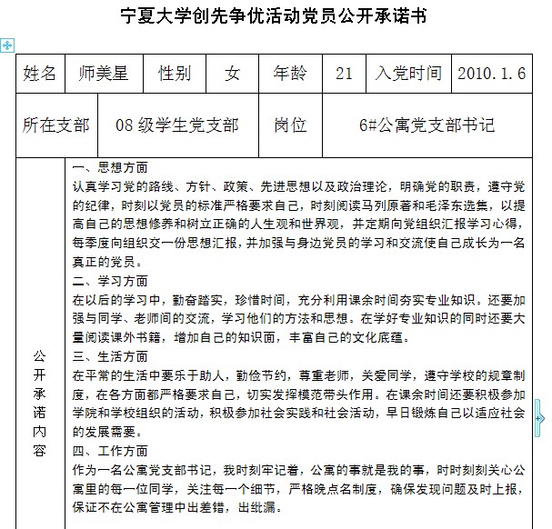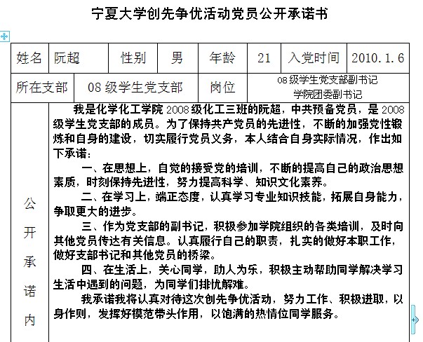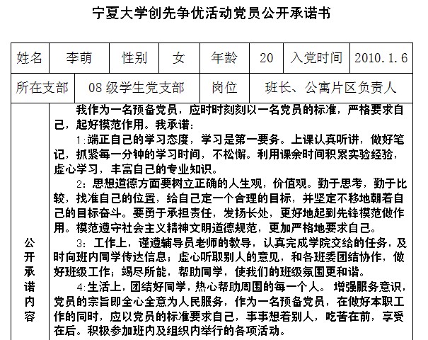 91黑料 创先争优活动党员公开承诺书(2008级党支部)