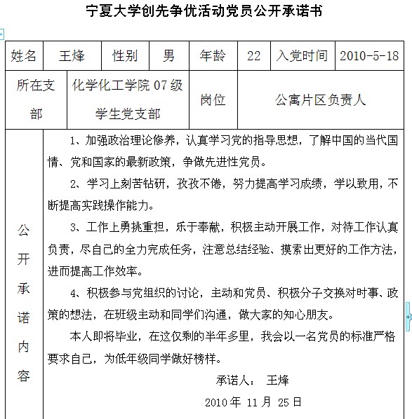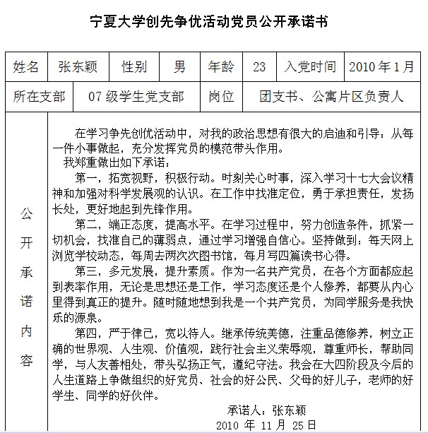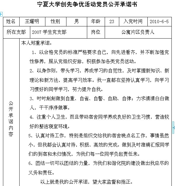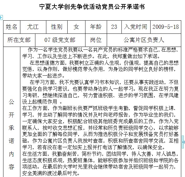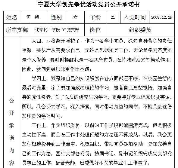 91黑料 创先争优活动党员公开承诺书(2007级党支部)