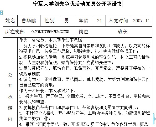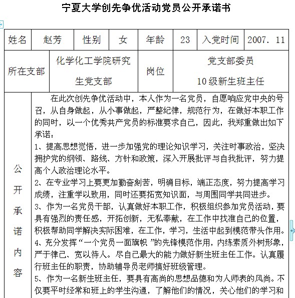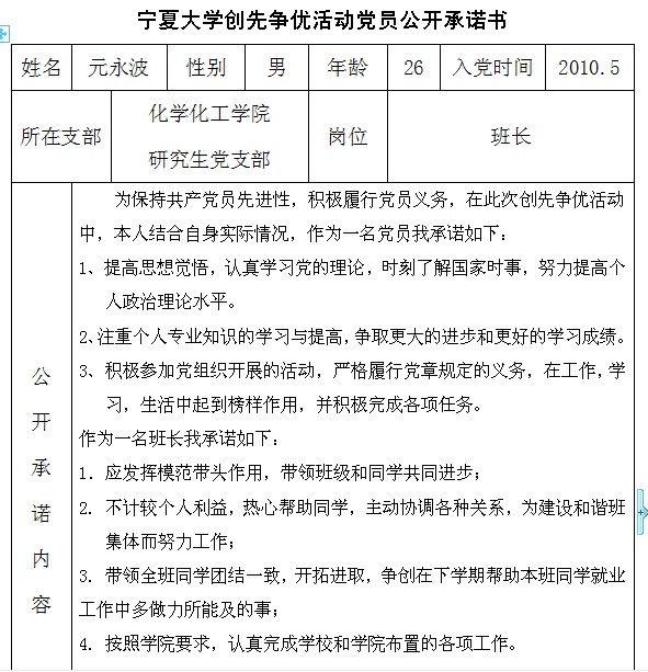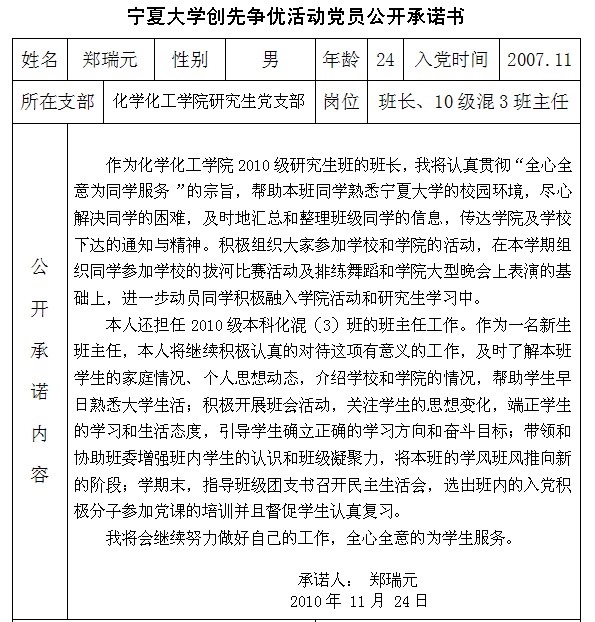 91黑料 创先争优活动党员公开承诺书(研究生党支部)