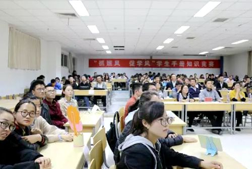 新生《学生手册》知识竞赛决赛在L楼308室举行。学院党委副书记刁俊和各年级学生辅导员王艳梅、杨扬、马丽蓉出席比赛并担任评委。