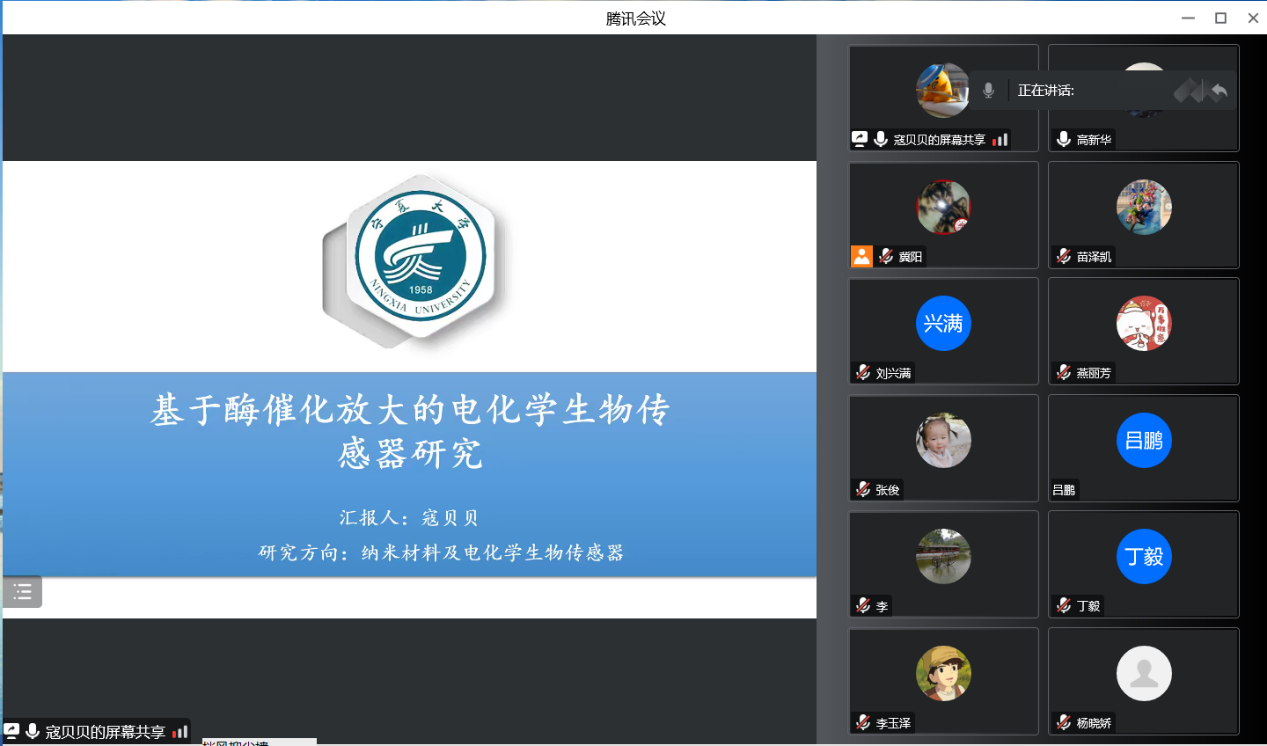 寇贝贝博士以“基于酶催化放大的电化学生物传感器研究”为题进行了汇报,立足提高酶催化效率的需求,借助纳米材料、DNA纳米结构等,从酶的固载量以及空间分布(酶间距、酶比例)方面入手,对酶活性进行有效调控,并结合多种信号放大策略提高灵敏度,构建高灵敏、高催化的电化学生物传感器应用于生物分子的定量检测。