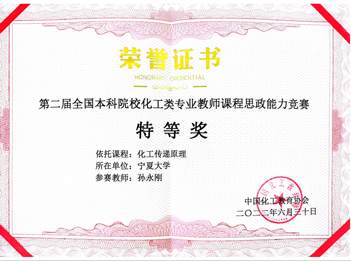 青年教师孙永刚在《化工传递原理》课程思政建设与教学能力竞赛中荣获特等奖。