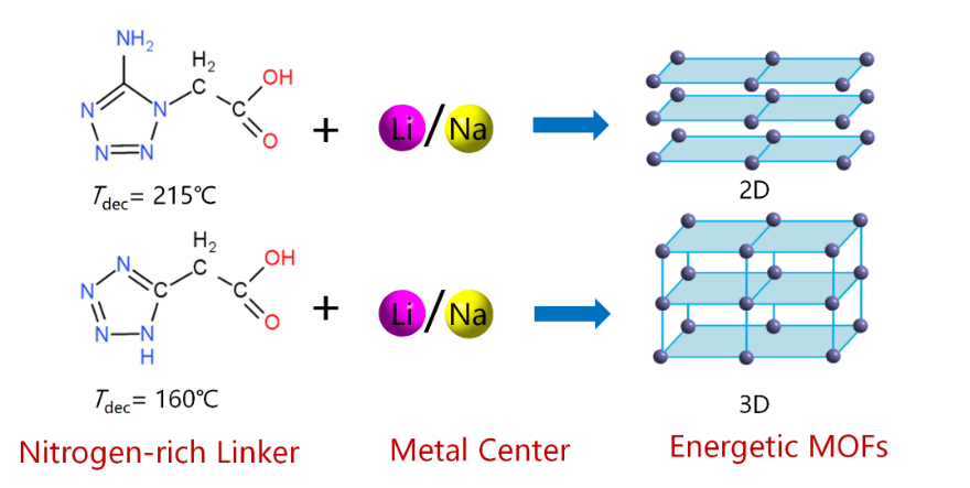 该研究选取富氮配体与碱金属Li和Na结合,制备了一系列无溶剂高能MOFs材料。热稳定性和能量性能测试发现,几例MOFs都具有良好的热稳定性和爆轰性能,且对于外部的机械刺激均展现出较低的敏感度;其中一例具有3D结构的Li-MOF显示出超高的热分解温度(403 °C)和爆炸热(3.475 kcal·g−1),成为了新型耐热含能材料的候选者。该研究实现了高能密度材料的高稳定性、高能量、低感度多重协同,推动了相关领域的发展。