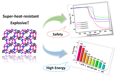 通常来说,耐热含能材料的耐热温度为300°C-350°C。这要求耐热含能材料不仅具有高的能量性能,同时也应具备优异的耐热性和稳定性,使其能够长时间暴露在高温高压等苛刻环境下。虽然耐热含能材料的相关研究不断被报道,但能量低、环境不友好、合成路线复杂等问题仍然有待解决。