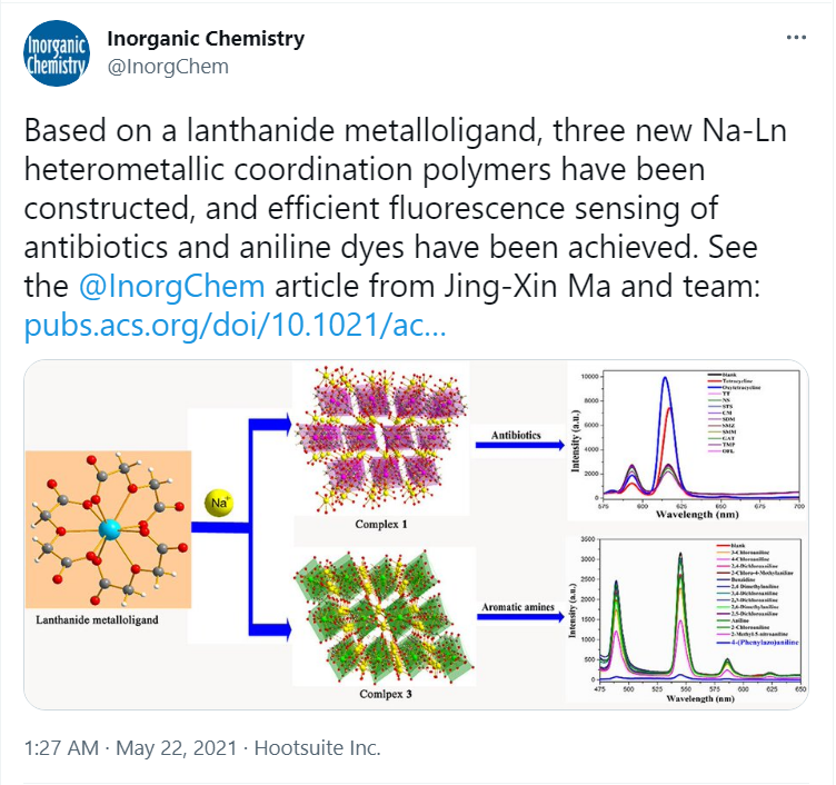 马景新课题组在有机污染物荧光检测研究方面取得了新进展,研究成果发表于国际知名期刊《Inorganic Chemistry》。论文题目:“Na-Ln Heterometallic Coordination Polymers: Structure Modulationby Na+ Concentration and Efficient Detection to TetracyclineAntibiotics and 4‑(Phenylazo)aniline”,DOI:10.1021/acs.inorgchem.1c00462。