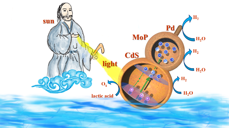 该研究将非贵金属2%MoP与微量贵金属0.006%Pd组装,再将复合助催化剂(Pd/MoP)担载在半导体CdS上,形成三元光催化剂(Pd/MoP)/CdS。(Pd/MoP)/CdS在可见光下的产氢活性是CdS的36.3倍、Pd/CdS的4.4倍和MoP/CdS的2.1倍,说明复合助催化剂优异的协同作用。马保军团队形象地将这种三元催化剂比拟为三节葫芦,将中国古典神话故事“八仙过海”中铁拐李的形象比作太阳,葫芦在水和阳光的共同作用下产生氢气。该模型对开发高效廉价产氢催化剂具有指导意义。