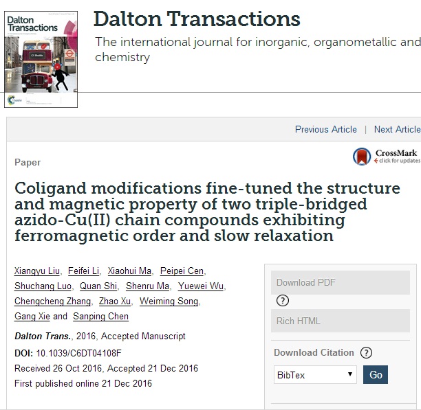 相关研究成果“Coligand modifications fine-tuned the structure and magnetic property of two triple-bridged azido-Cu(II) chain compounds exhibiting ferromagnetic order and slow relaxation”,在线发表于具有重要学术影响力的老牌期刊“Dalton Transactions”(影响因子4.177)[Dalton Trans., 2016, Accepted Manuscript, DOI: 10.1039/C6DT04108F]。全文链接://pubs.rsc.org/en/content/articlelanding/2016/dt/c6dt04108f#!divAbstract。研究工作获得了国家自然科学基金项目(Nos. 21463020)的资助。