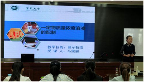2013级化学师范专业范少英等十位本科生,每人进行了十分钟中学化学模拟课堂授课。“准老师们”将导入、讲解、提问、演示、信息化、强化、变化、试误、结束等微格教学技能运用到讲课过程中;“准老师们”独具匠心的PPT课件,条理清晰的板书设计,驾轻就熟的实验规范操作,有声有色的语言表达;大方得体的教师礼仪赢得观众的热烈掌声,老师们看到经过辛苦灌溉的桃李芬芳,也纷纷点头称赞。