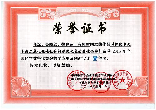 3月18日,我校化学师范硕士生任斌、本科生徐建菊、蒋思雪等设计的《探究水泥负载二氧化锰催化分解过氧化氢的最佳条件》作品,在全国第五届“威尼尔(Vernier)杯”化学数字化实验教学应用及创新设计大赛决赛中荣获一等奖。