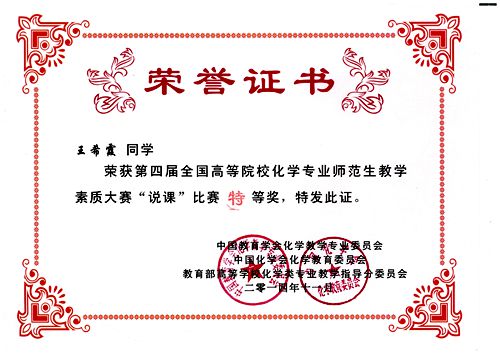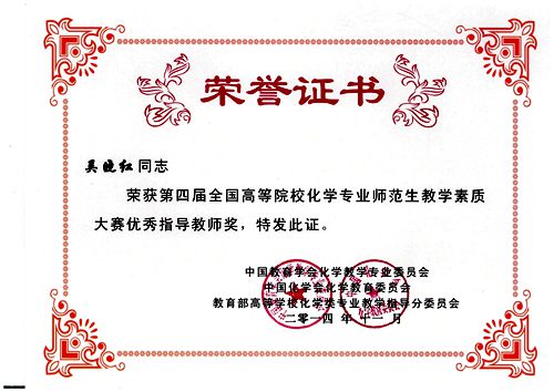 教师吴晓红、杨文远,化学课程与教学论硕士研究生毕吉利、高霞、孙婕、任斌、黄金莎、肖敏、李文婷获“优秀指导教师”奖。