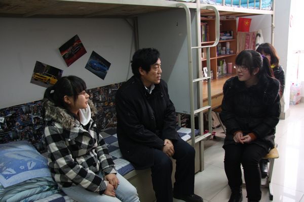 在15号楼学生公寓,许校长看望了化工学院2010级李山、2011级王海哲同学。李山同学早年父母离异,后母亲病逝,与弟弟相依,成为孤儿;王海哲同学来自宁南山区,单亲家庭,家里孩子多,经济十分困难。许校长仔细查看了学生的住宿条件,亲切地询问同学们“是否适应大学的生活?学习、生活有没有困难?”,他进一步向辅导员了解化工学院贫困生比例和接受学校助学金资助情况,要求辅导员要深入学生,把工作做细。许校长鼓励贫苦生要勇于克服困难,坚持把学习搞好。