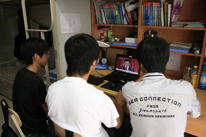 12#公寓党员活动室传来了庄严的国歌声,公寓党支部组织70名学生党员通过电视集体收看中共中央庆祝中国共产党成立90周年大会盛况。许多学生在宿舍通过电脑、收音机收看、收听胡锦涛总书记的重要讲话。