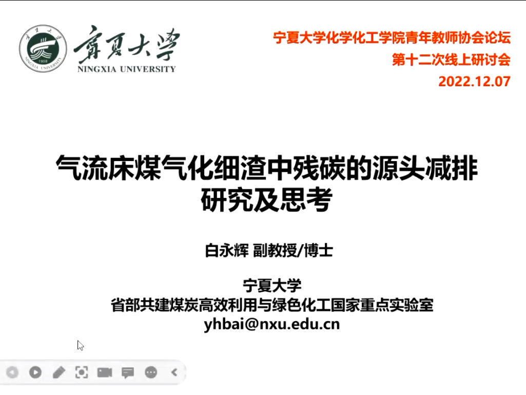 白永辉老师以“气流床煤气化细渣中残碳的源头减排研究及思考”为题,针对煤气化细渣多组分精细化深度分离与高值功能材料的制备理论与方法进行深入探讨。报告还对宁东其它工业固废处理需求及政策进行解析,并建议青年教师研究方向与当地生态文明建设与技术需求相结合以更好服务地方。