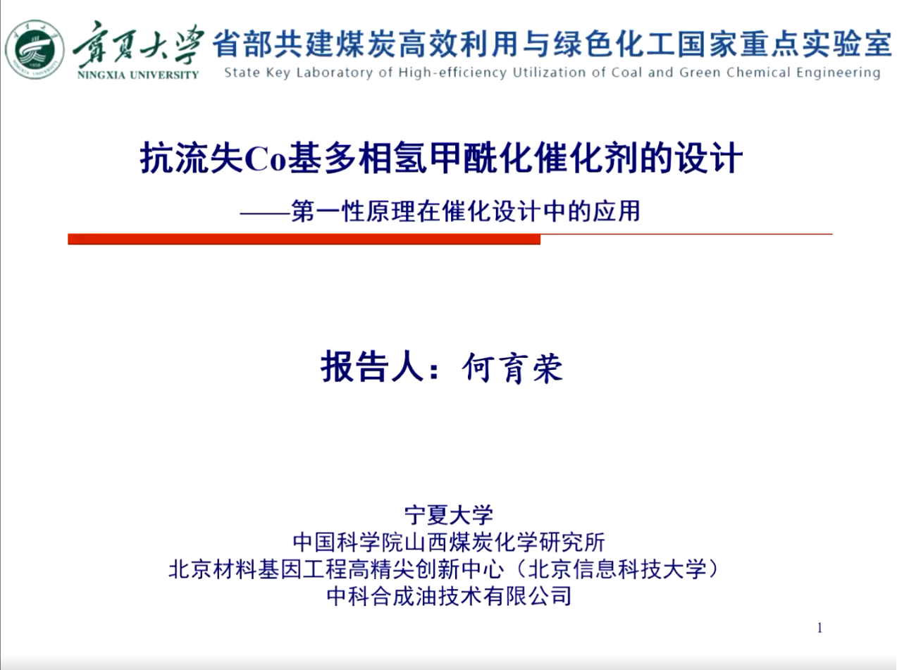 何育荣老师以“抗流失Co基多相氢甲酰化催化剂的设计”为题,从第一性原理计算和实验角度解读了金属催化剂在CO气氛下流失的机制,并通过金属间化合物的引入设计合成稳定的多相氢甲酰化催化剂,最后通过理论计算预测了新多相氢甲酰化的反应机理,为催化剂的设计和认识提供了新思考。