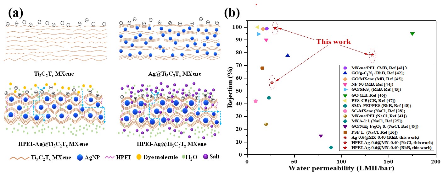 “膜分离材料与过程”创新团队在膜领域顶级期刊、中科院一区Top期刊《Journal of Membrane Science》发表了题为“Highly permeable and stable hyperbranched polyethyleneimine crosslinked AgNP@Ti3C2TxMXene membranes for nanofiltration”的研究论文,提出了一种具有高渗透性和高稳定性MXene基纳滤膜的构筑策略。
