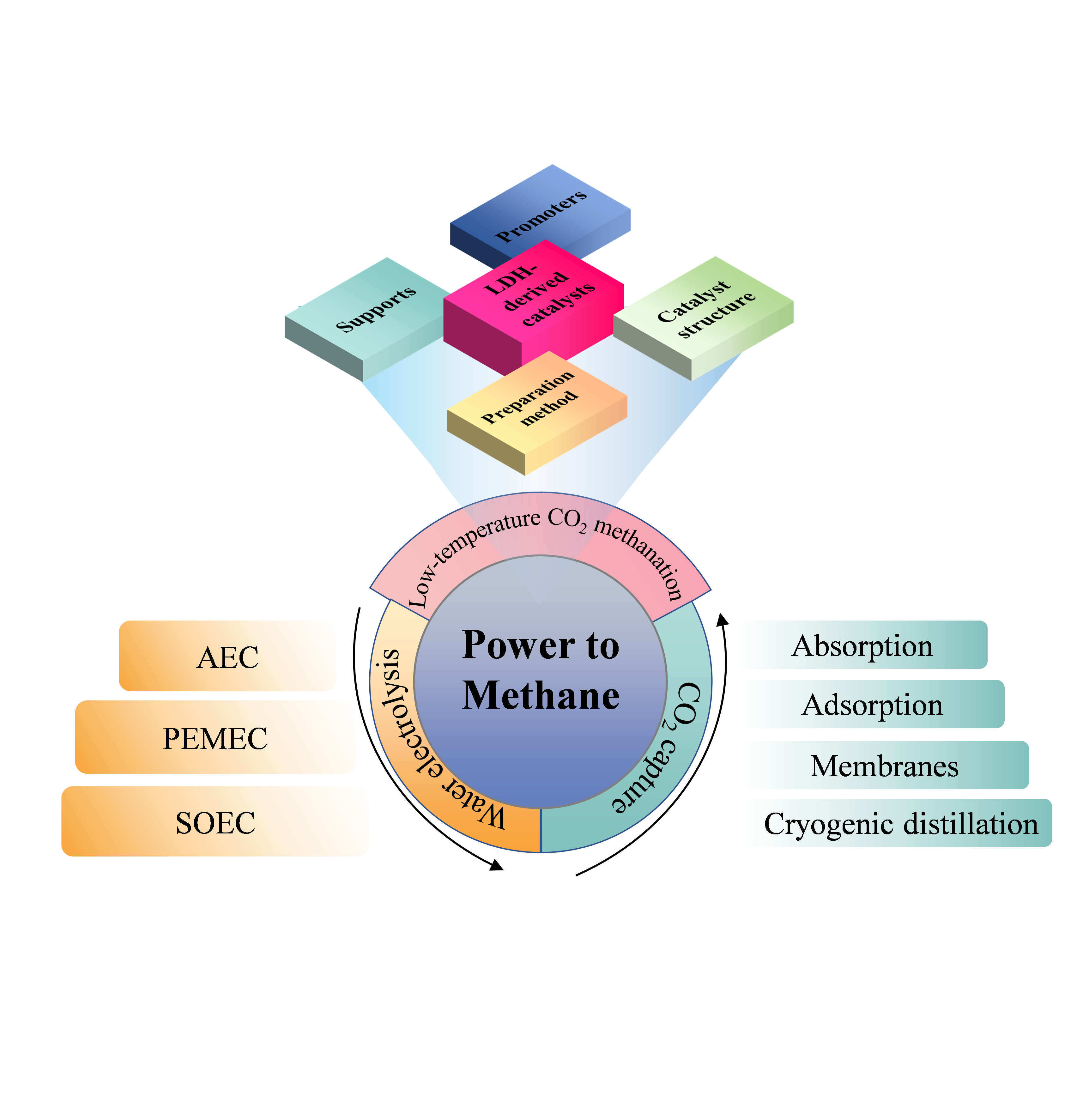 本工作从电解水制氢和CO2分离捕获技术出发,综述了低温高效CO2甲烷化催化剂的发展现状,讨论了PtM技术面临的挑战和应用前景,有助于读者更好地理解PtM技术链,并为工业低温甲烷化催化剂设计提供参考。
