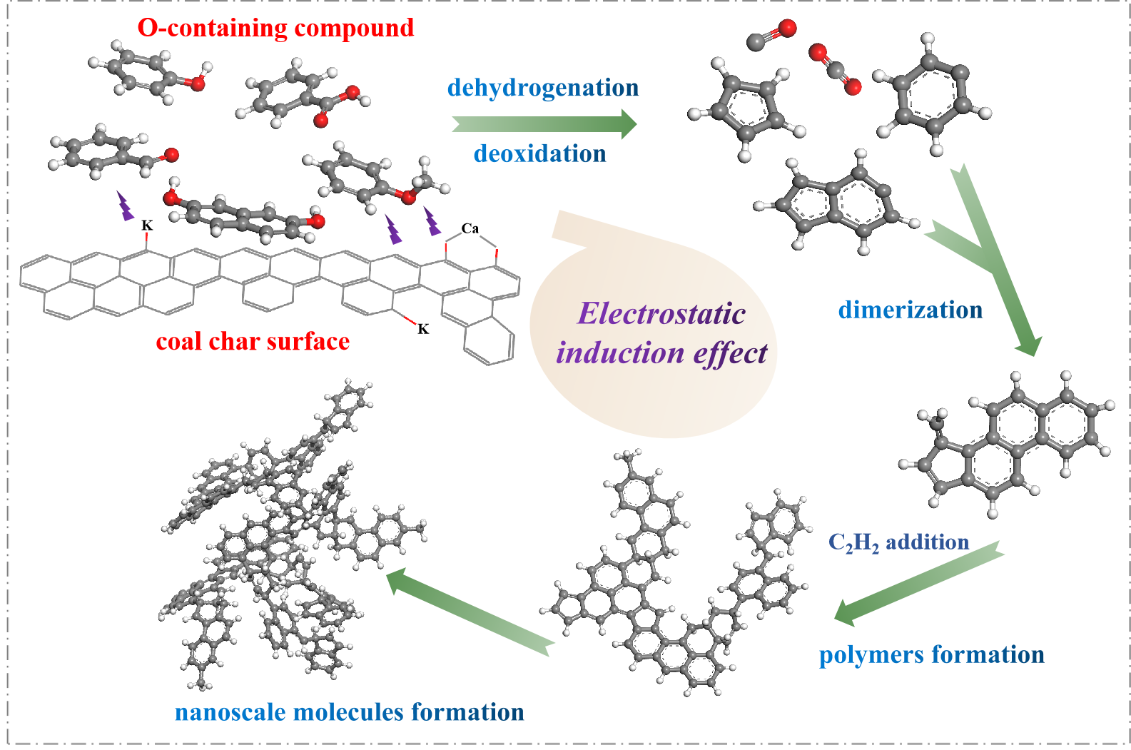 该项成果结合反应分子动力学模拟和密度泛函理论计算,阐述了分子微观尺度静电化学吸附效应下各含氧结构化合物在交互反应过程的化学吸附及键断裂反应行为,研究表明,C−O活性位的结构特性极大地降低碳环结构重排所需能垒,促使环戊二烯基形成,同时煤分子碎片活性位提供的电子可有效促进酚羟基的活化,使分子轨道能隙降低加速交互反应进程,阐明挥发分−半焦交互作用微观反应机理。