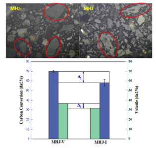 该工作采用滴管炉进行快速加热条件下的气化,收集气化残碳,利用原位高温热台–显微镜联用装置研究了其在气化过程中的颗粒收缩破碎变化规律。研究表明,高温短停留时间条件下镜质组气化碳转化率高于惰质组,但其最终完全转化需要更长的诱导期来实现。气化过程主要促进了残炭介孔结构的发育,镜质组残碳相较于惰质组具有更丰富的孔隙结构和更大的比表面积,且镜质组气化残碳芳构化和石墨化程度更低,活性位点更丰富,反应活性更高。该工作从煤化学的角度阐明了气流床气化条件下细渣残碳与煤显微组分结构间的重要关系,对于从源头控制残碳的形成具有重要意义。