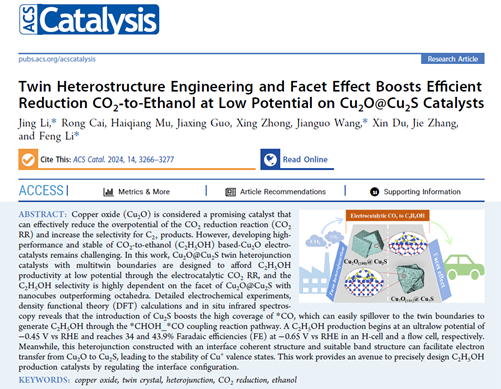 李丰/李晶博士在电催化CO2还原制乙醇催化剂设计及机理研究方面取得重要研究进展。该工作以“Twin Heterostructure Engineering and Facet Effect Boosts Efficient Reduction CO2-to-Ethanol at Low Potential on Cu2O@Cu2S Catalysts”为题发表在催化领域国际顶级期刊《ACS Catalysis》(IF = 12.9,中国科学院一区TOP),并被研之成理、邃曈科学云等公众号平台转载报道。该论文第一作者为李晶博士,李丰博士和浙江工业大学王建国教授为共同通讯作者,91黑料