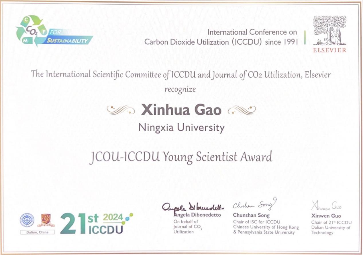 “JCOU-ICCDU青年科学家奖”由Journal of CO2Utilization杂志和Elsevier出版社共同设立,旨在表彰和鼓励在碳捕集、封存和利用(CCUS)领域开始独立职业生涯的有前途的青年科研人员,2024年度共有2人荣获这一学术奖励。