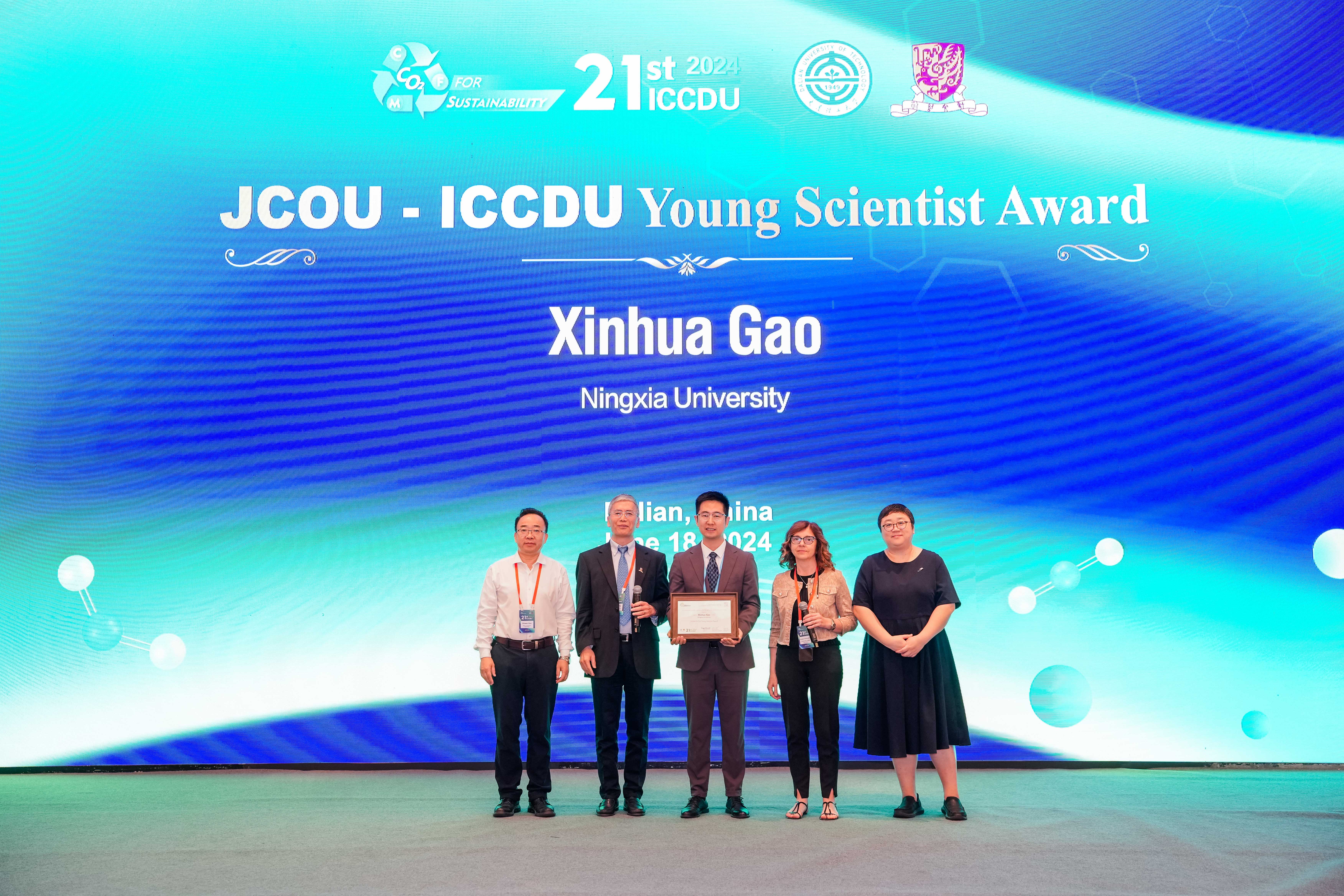 青年教师高新华博士荣获JCOU-ICCDU青年科学家奖(Young Scientist Award)。大会主席、大连理工大学郭新闻教授、香港中文大学宋春山教授及ICCDU国际科学委员会副主席Angela Dibenedetto教授、Elsevier资深期刊出版人Emilie Wang博士共同为高新华老师颁发获奖证书。