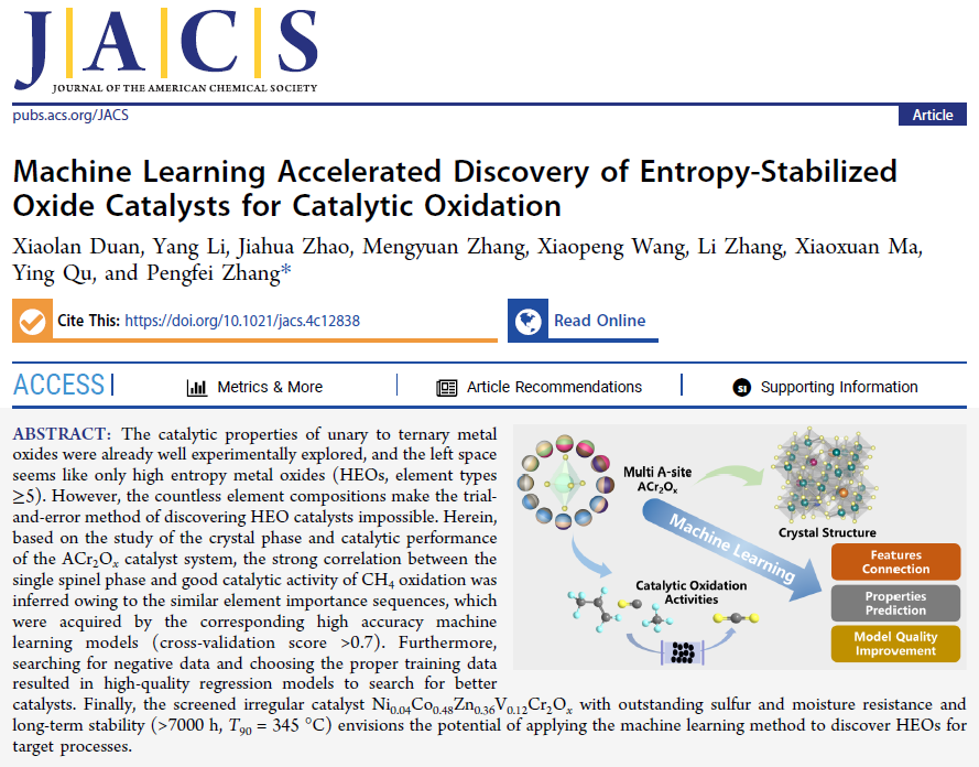 论文信息:Machine Learning Accelerated Discovery of Entropy-Stabilized Oxide Catalysts for Catalytic Oxidation, Journal of the American Chemical Society, 2024. //doi.org/10.1021/jacs.4c12838.