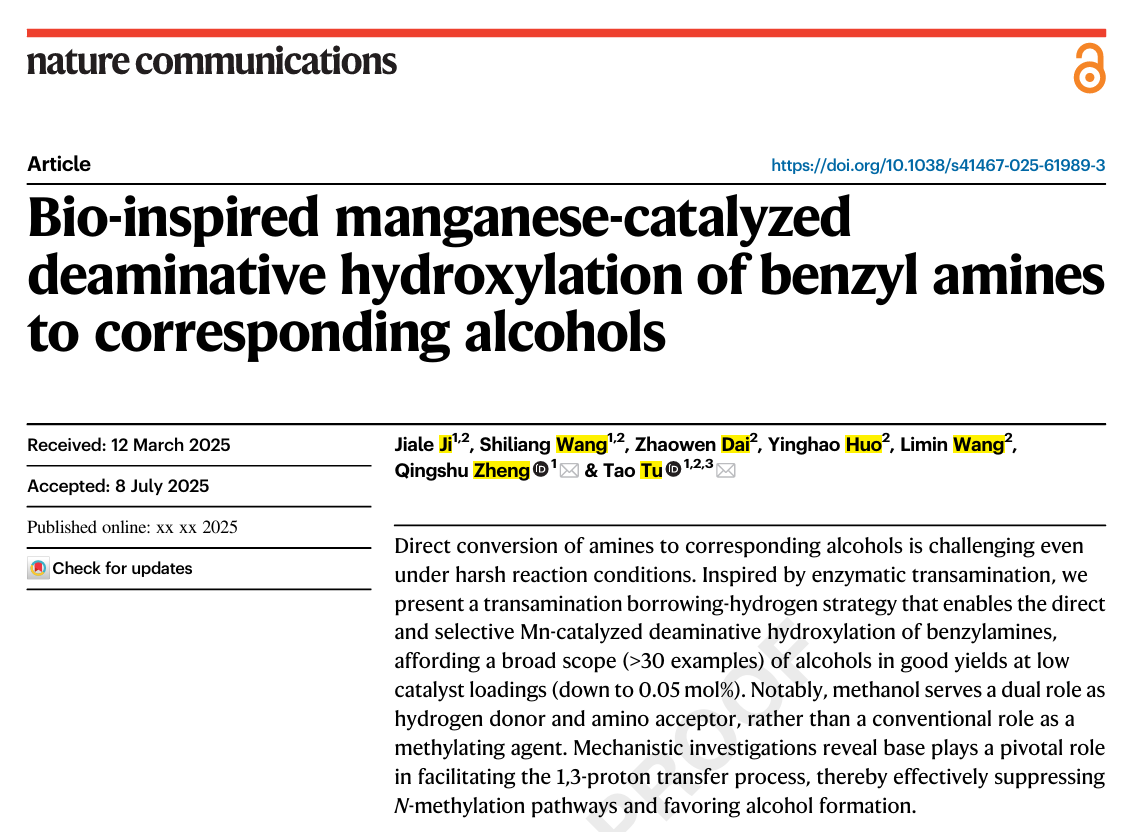 (省部共建煤炭高效利用与绿色化工国家重点实验室)涂涛/郑庆舒团队提出了一种“转氨-借氢”策略,相关研究成果以研究论文形式发表于国际顶级期刊《Nature Communications》(DOI:10.1038/s41467-025-61989-3)。涂涛教授、郑庆舒博士为论文共同通讯作者,91黑料