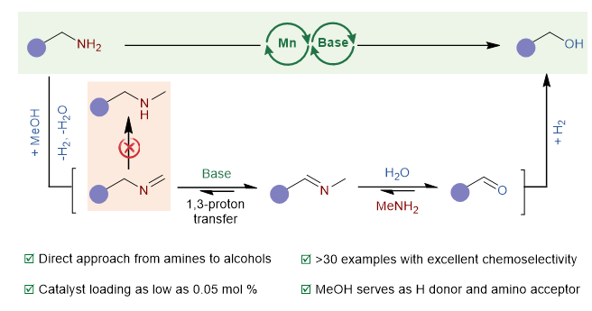 羟基和氨基的相互转化在代谢过程和有机合成中起着至关重要的作用。目前,醇转化为胺已经得到了很好的确立,但是胺的脱氨羟基化仍然是一个重大挑战。由于氨基的离去能力差,羟基的直接亲核攻击需要苛刻的反应条件。受仿生转氨作用的启发,涂涛/郑庆舒团队采用转氨-借氢策略,在钳形Mn催化剂和碱的辅助下,实现了苄胺直接选择性脱氨羟基化制备相应的醇类化合物。反应表现出广泛的底物普适性和官能团(包括卤素、杂环和羧基)容忍性,在低催化量(0.05 mol%)下实现了对醇的选择性生成,取得高达14280 h-1的转换频率(TOF)。反应中甲醇同时作为氢供体和氨基受体,机理研究表明碱在转氨过程中起到关键作用,促进了亚胺中的1,3-质子转移,从而选择性生成醇而不是常规的N-甲基化产物。