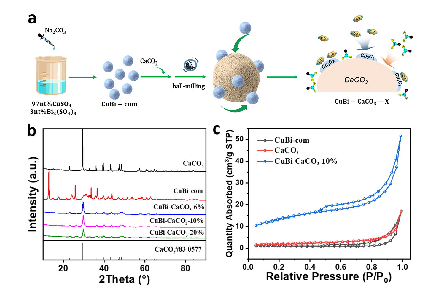 1,4-丁二醇(BDO)是生物降解塑料的关键前体,其工业合成通常采用Reppe工艺,使用CuBi催化剂,但该催化剂存在炔烃-醛偶联活性低及快速失活的问题。本研究通过一种新型自上而下的固态再分散策略,开发了CuBi/CaCO3双功能催化剂。CaCO3载体增强了甲醛的活化,并促进了Cu-Bi活性位点表面的炔烃-醛类偶联反应。优化后的CuBi-CaCO3-10%催化剂在40小时连续运行过程中,丁二醇(BYD)收率较商业催化剂高出四倍,且经过三个循环后仍保持高活性,而商业催化剂(CuBi-com)则完全失活。动力学和原位FTIR分析揭示了稳定性机制:(i)CaCO3介导的醛活化加速了主反应路径并抑制了副反应。(ii)强Cu-Bi/CaCO3金属-载体相互作用稳定了Cu⁺物种。本研究为工业BDO生产提供了高性能催化策略,强调了定制金属-载体界面与优化反应动力学之间的协同作用。