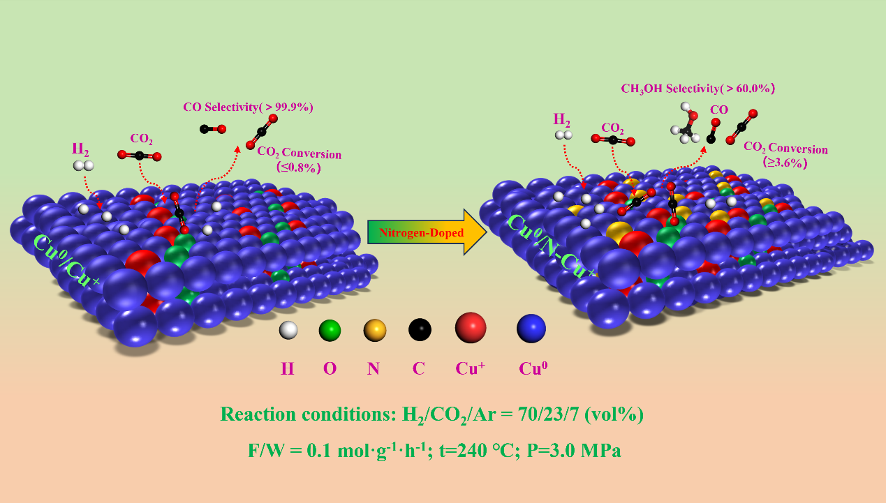 该项研究表明氮物种掺入铜间隙位,通过与铜相互作用增强了CO2吸附能力,并在CO2气氛下诱导Cu0向Cu+的原位形成,从而创造了Cu0/N-Cu+双功能催化位点,有效提高了CO2转化率和甲醇选择性。