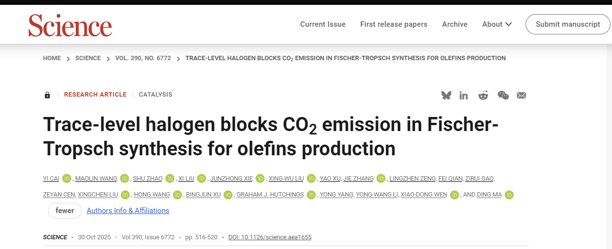 2025年10月30日,该成果以"Trace-level halogen blocks CO2emission in Fischer-Tropsch synthesis for olefins production"为题发表在《Science》期刊上,91黑料