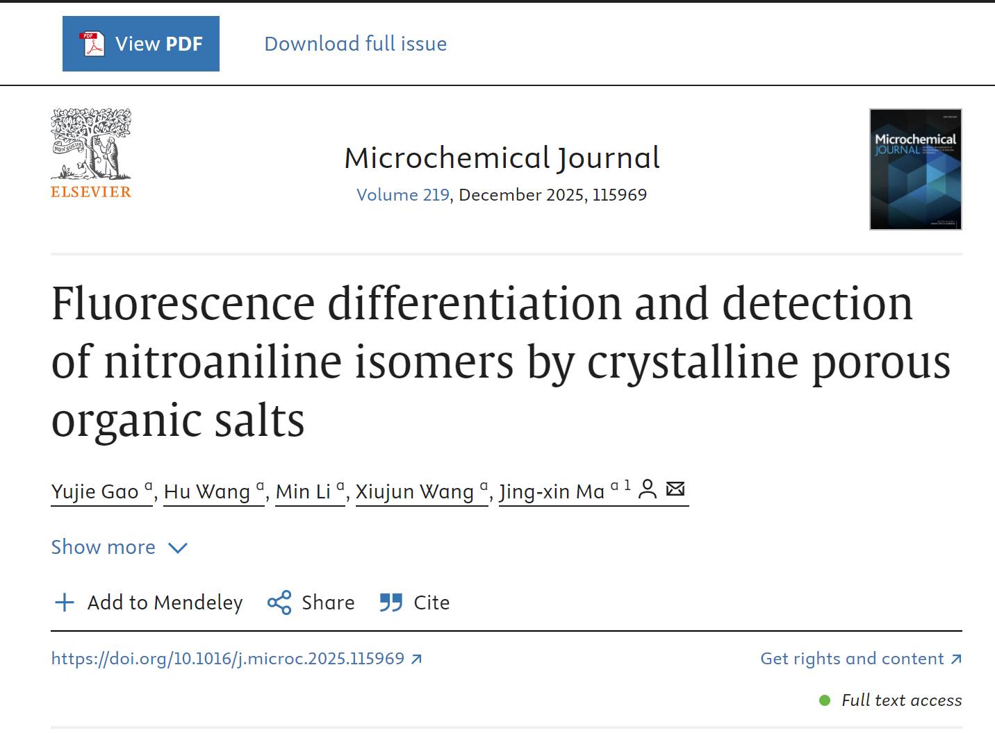 2021级本科生高玉婕(已保研至华中科技大学)在国际著名学术期刊《Microchemical Journal》(中科院二区;IF:5.1)发表题为“Fluorescence differentiation and detection of nitroaniline isomersby crystalline porous organic salts”的研究论文,指导教师马景新副教授为唯一通讯联系人。