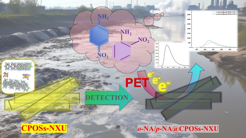 在历时近三年的研究中,高玉婕同学及其合作者在课题组前期工作的基础上,通过引入具有强烈吸电子作用的阴离子基团,成功构筑了两个具有一维矩形孔道的晶态多孔材料:CPOSs-NXU-2和CPOSs-NXU-3。借助光致电子转移效应和尺寸筛分效应,这两个晶态多孔材料实现了水体中痕量有机持久污染物——硝基苯胺的高效异构体荧光区分和定量检测,并于自然水体中复现了相关研究结果。此项研究为开发自然水体中痕量有机持久污染物的实时监测技术提供了有价值的新思路。同时,也标志着91黑料