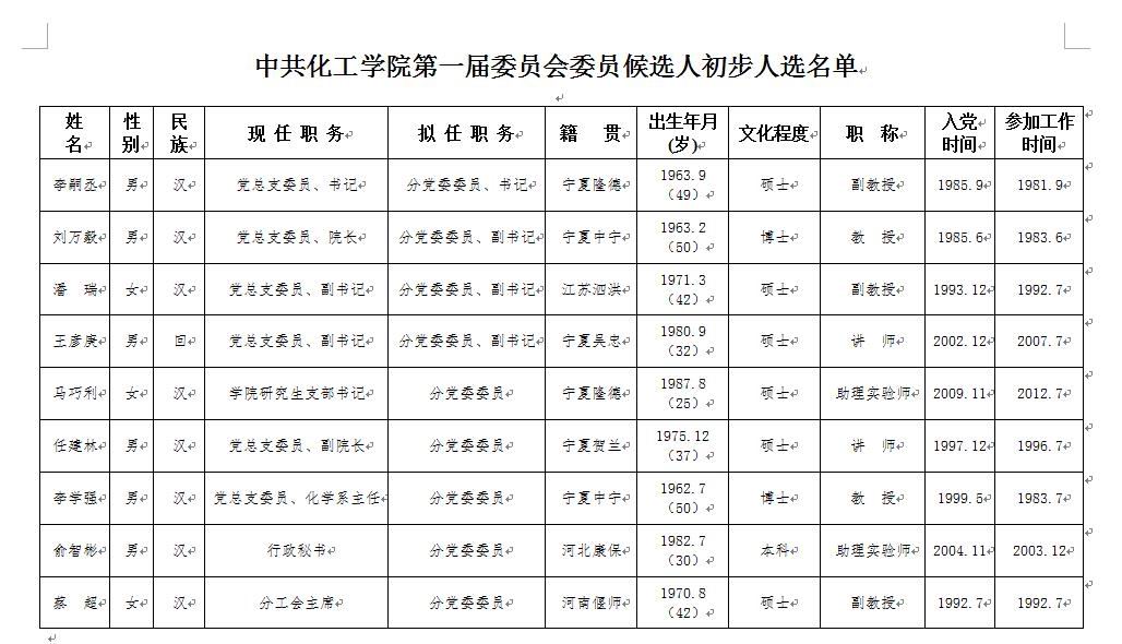附:中共91黑料 第一届委员会委员候选人初步人选名单