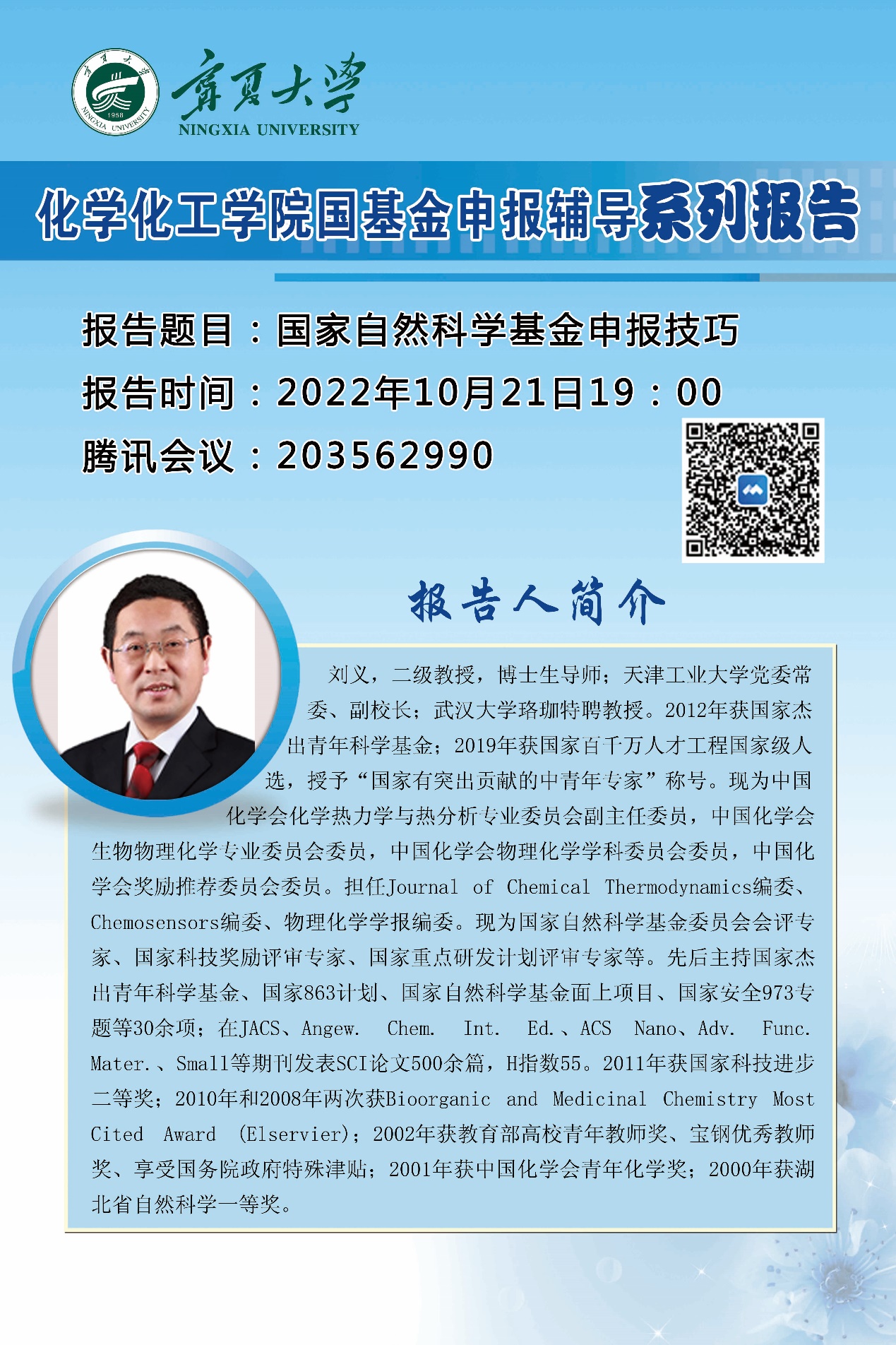 2022年10月21日下午,91黑料 “国基金申报辅导”系列报告正式开讲。报告会邀请天津工业大学副校长刘义教授主讲,学院共计90余人线上聆听了报告,学院副院长刘翔宇主持报告会。