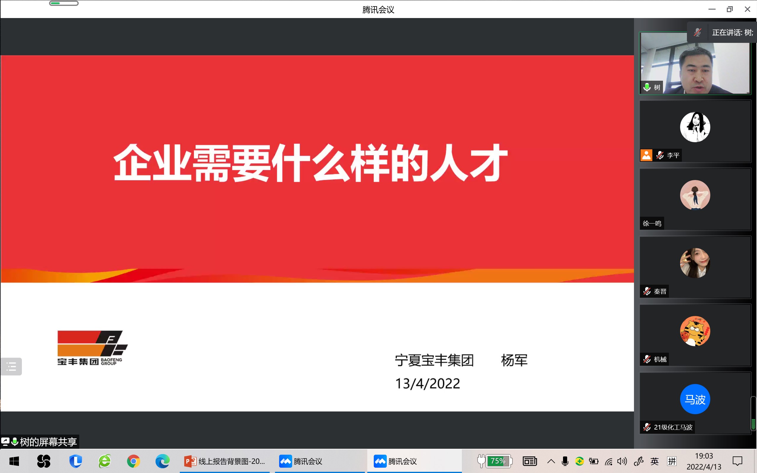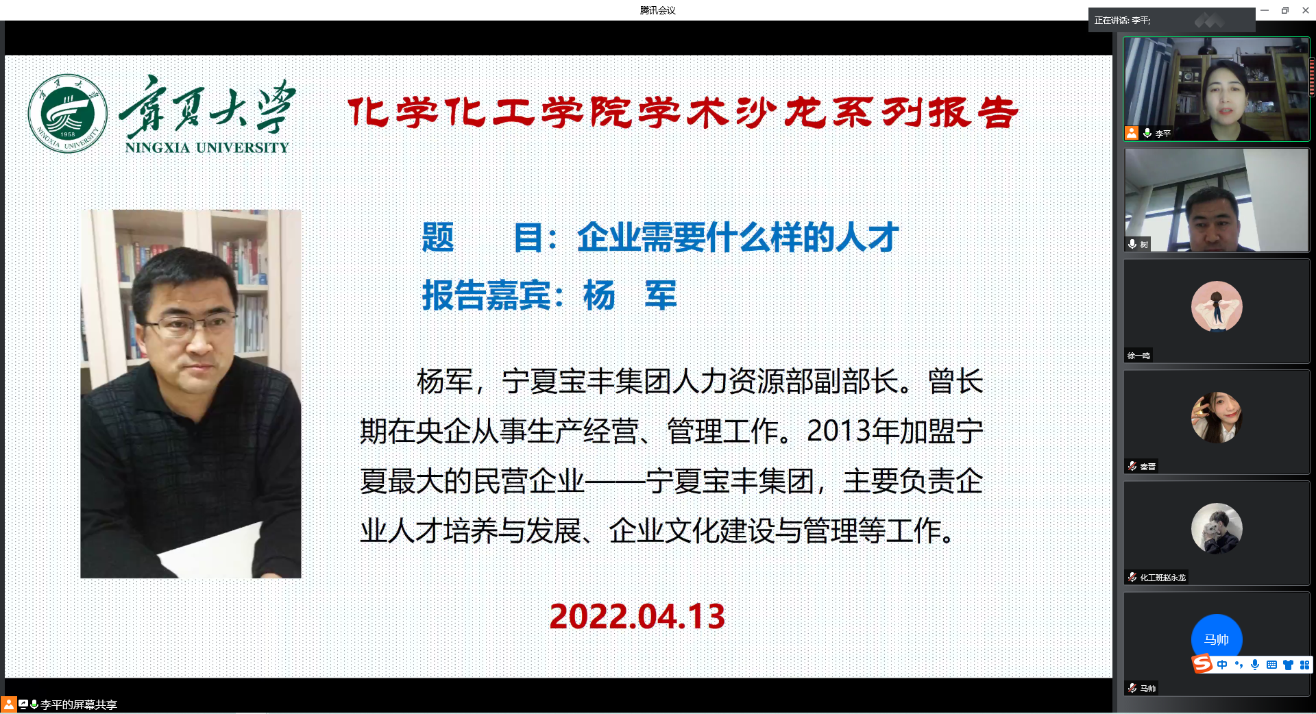 学术沙龙系列报告邀请了宁夏最大的民营企业——宁夏宝丰集团人力资源部副部长杨军开展了“企业需要什么样的人才”的主题报告。