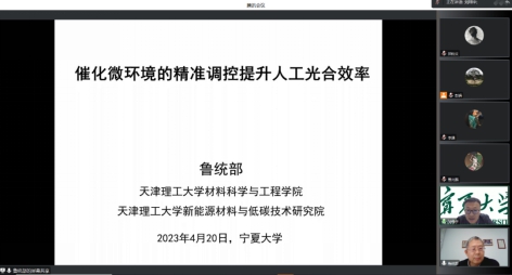 鲁统部教授以“催化微环境的精准调控提升人工光合效率”为题,深入浅出讲述了人工光合作用的意义和目标。详细讲述了提高人工光合效率的重难点与研究思路,重点讲述了从光敏中心吸光效率、光生载流子传输效率和催化中心催化效率三个方面提高人工光合效率的研究策略。